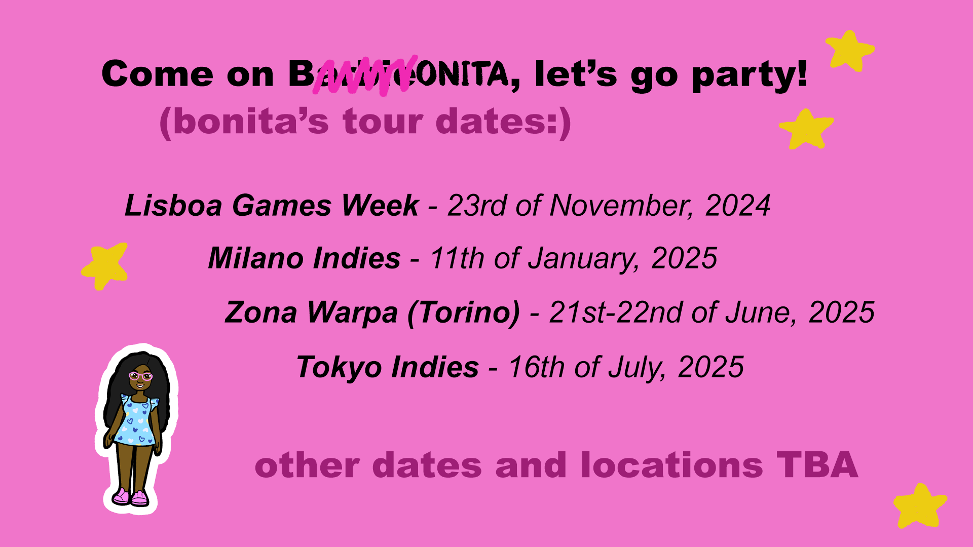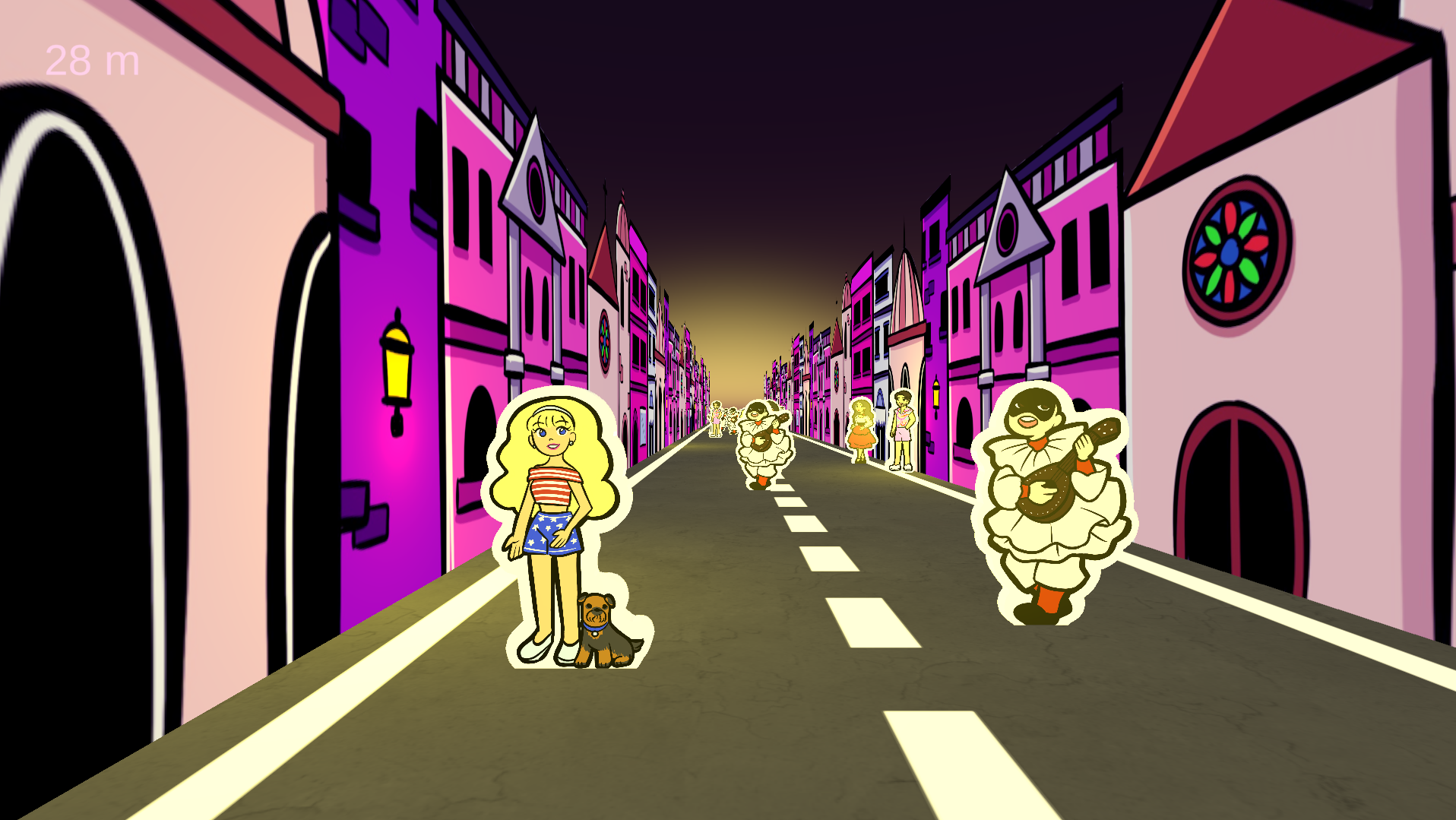 Bonita is an alternative controller game where the player controls a drunk Barbie through the street at night.